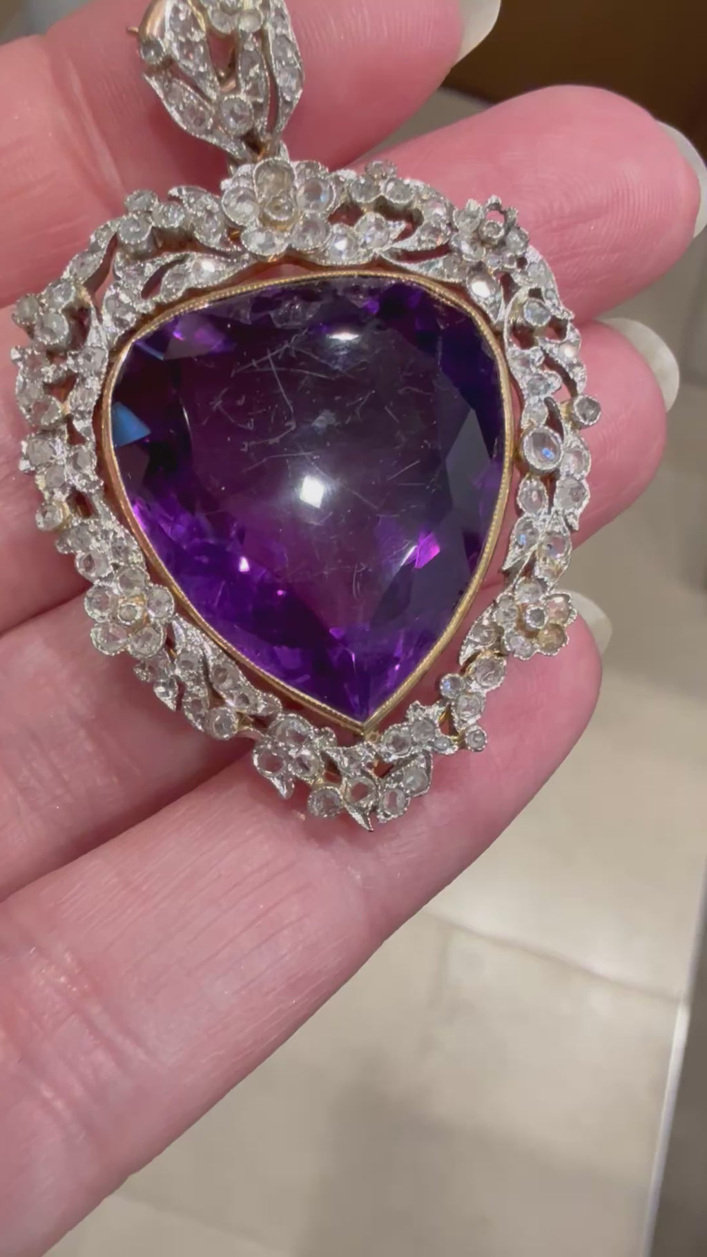 The amethyst is framed in a yellow gold bezel with a platinum top, while the back reveals beautifully preserved hand-engraved scrollwork around the pavilion. The diamond-set bail adds additional sparkle and refinement. Large in scale at 53.6 × 34 mm, this piece commands attention yet maintains the delicacy of fine antique metalwork.